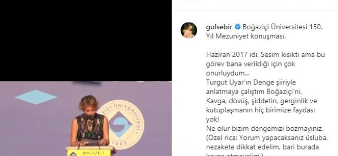 Birsel o anları Instagram hesabından "Boğaziçi Üniversitesi 150. Yıl Mezuniyet konuşması. Haziran 2017 idi. Sesim kısıktı ama bu görev bana verildiği için çok onurluydum... Turgut Uyar’ın Denge şiiriyle anlatmaya çalıştım Boğaziçi’ni. Kavga, dövüş, şiddetin, gerginlik ve kutuplaşmanın hiç birimize faydası yok! Ne olur bizim dengemizi bozmayınız" notuyla paylaştı.