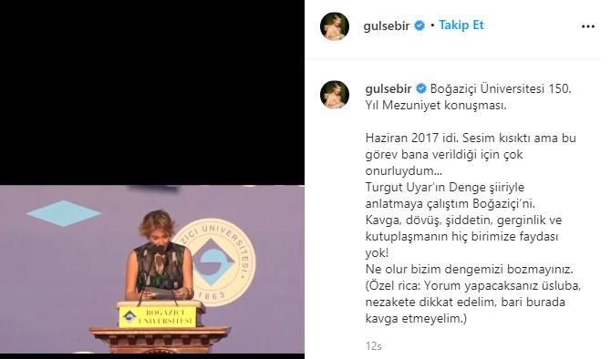 Boğaziçi Üniversitesi'nde Cumhurbaşkanı kararıyla Boğaziçi Üniversitesi’ne atanan eski AKP milletvekili aday adayı Prof. Dr. Melih Bulu’ya karşı protestolar devam ederken senarist ve oyuncu Gülse Birsel, Boğaziçi Üniversitesi 150. yıl mezuniyet konuşmasını paylaştı.