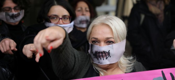 Kadın hakları savunucusu 20 kadın, ağızlarına dudakların dikilerek kapatılmış gözüktüğü fularlar sararak duruşmaya katıldı.