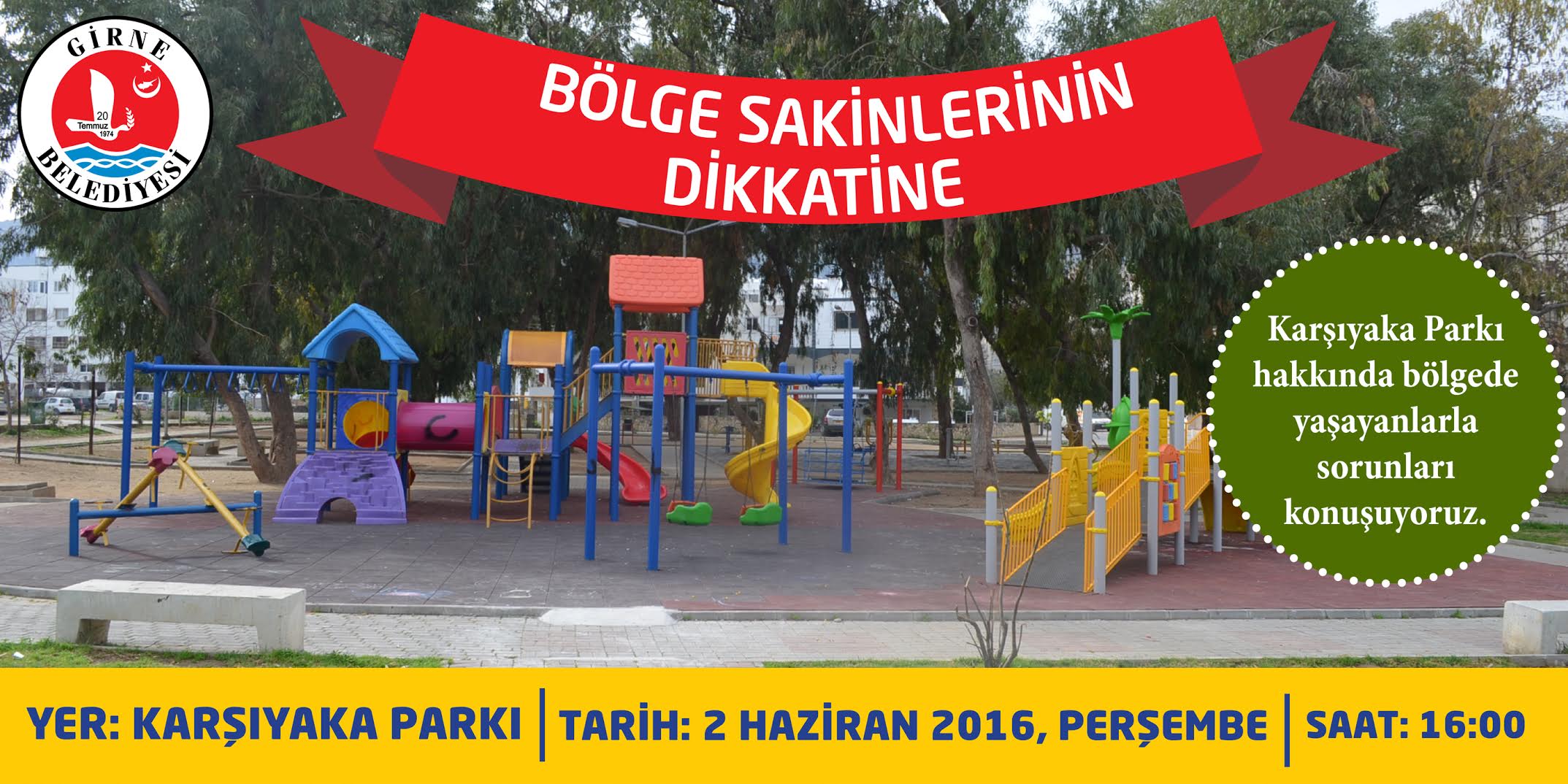 Girne Belediye Başkanı Nidai Güngördü, Karşıyaka Parkı ve bölge sakinlerinin sorunlarını konuşmak amacıyla 2 Haziran 2016 Perşembe günü saat 16:00’da Karşıyaka Parkı’nda bölge sakinleriyle buluşuyor.