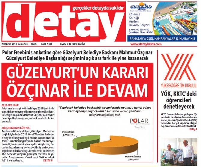 Polar Freebirds araştırma şirketinin Mayıs 2018 tarihinde yaptığı kamu oyu yoklamasına göre Güzelyurt Belediye Başkanı Mahmut Özçınar Güzelyurt Belediye Başkanlığı seçimi açık ara fark ile kazanacak.