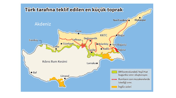 Bugünkü Milliyet Gazetesinde yayınlanan harita ile Rum tarafının Türk tarafından istediği iddia edilen bölgeler gösteriliyor.