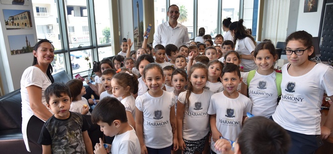 Başkan Harmancı kabulde cocuklarla tek tek ilgilenerek sorularını cevapladı. Grand Harmony Education Center öğrencileri de ziyarette Başkan Harmancı’ya geri dönüşümü simgeleyen döviz çalışmalarını takdim etti.