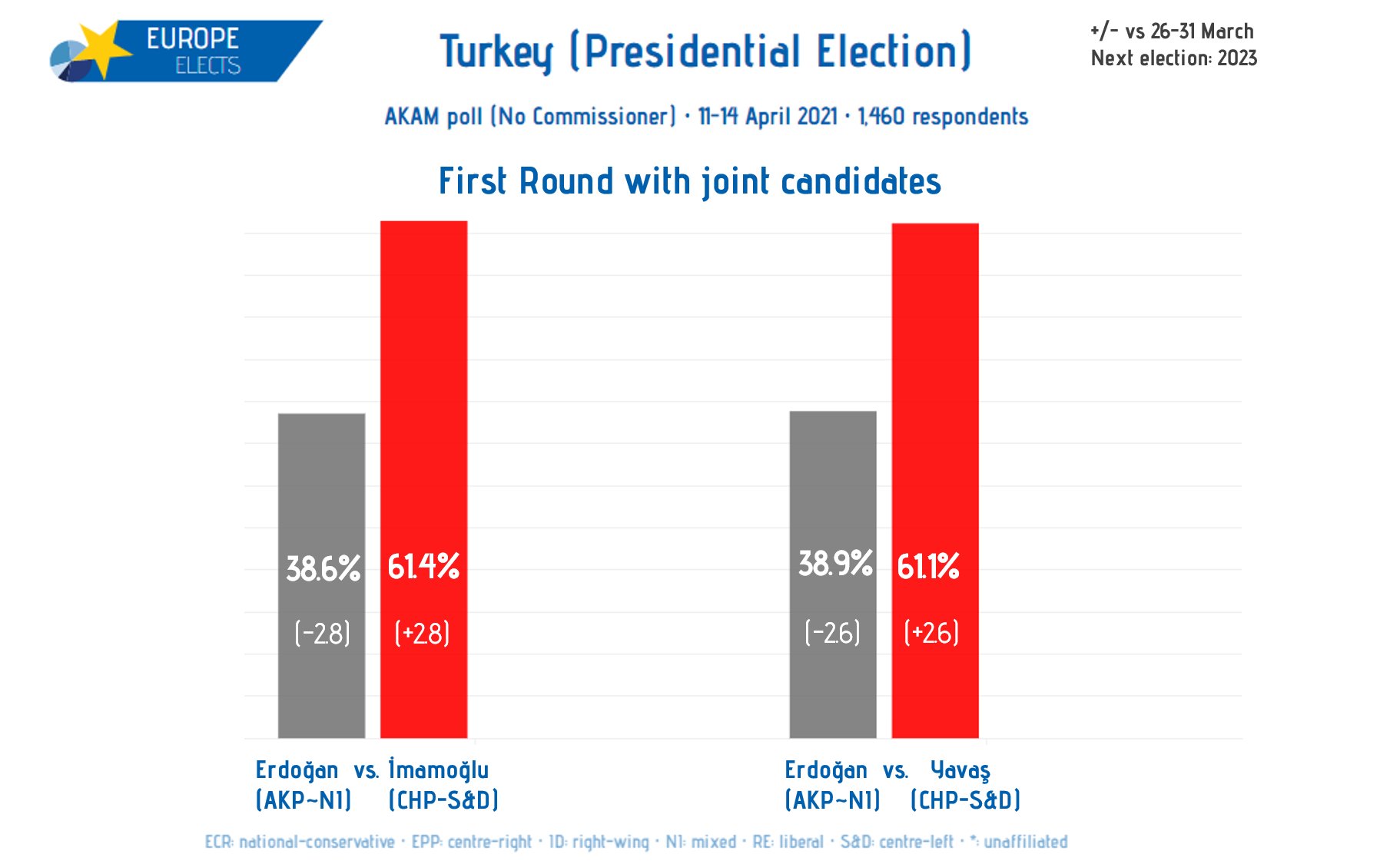 11-14 Nisan tarihleri arasında yapılan anket çalışmasında olası bir Cumhurbaşkanlığı seçiminde; Erdoğan, İmamoğlu ve Yavaş arasında yapılan seçimde her iki ismin de Erdoğan'ı geçtiği görüldü.