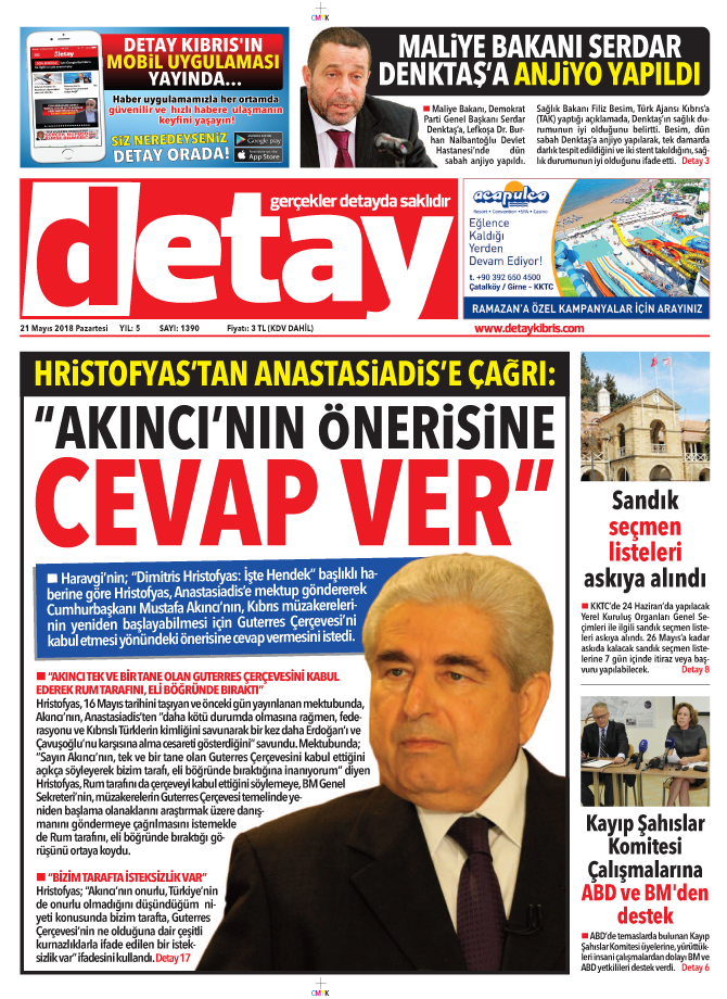Haravgi’nin; “Dimitris Hristofyas: İşte Hendek” başlıklı haberine göre Hristofyas, Anastasiadis’e mektup göndererek Cumhurbaşkanı Mustafa Akıncı’nın, Kıbrıs müzakerelerinin yeniden başlayabilmesi için Guterres Çerçevesi’ni kabul etmesi yönündeki önerisine cevap vermesini istedi.