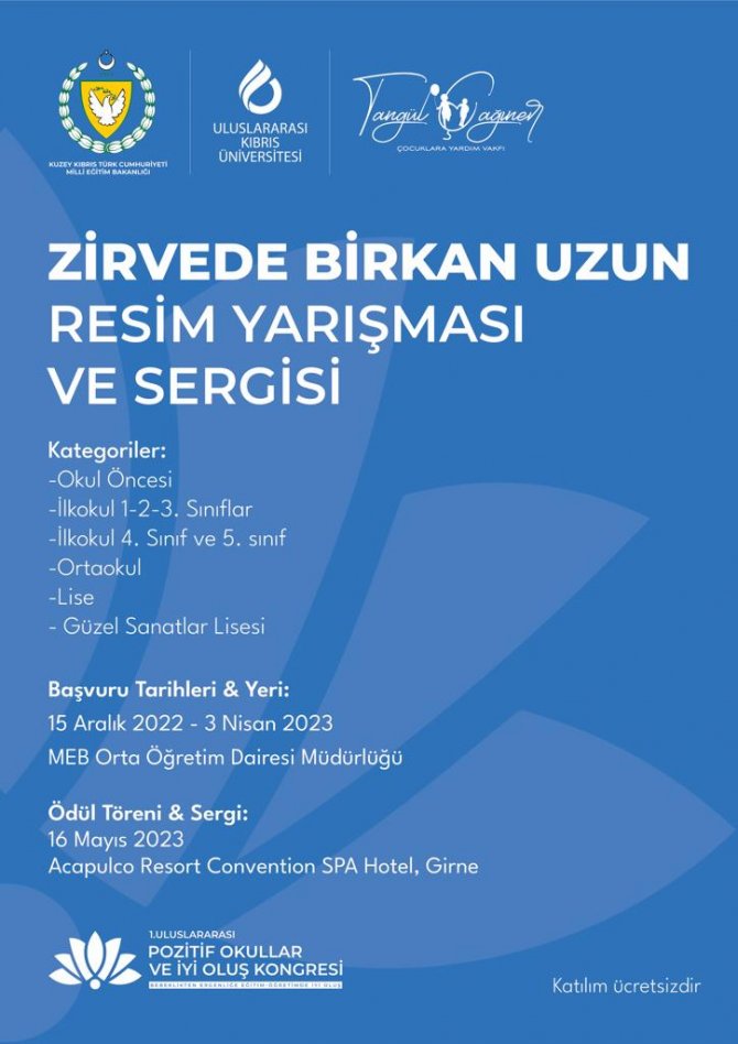 I. Uluslararası Pozitif Okullar ve İyi Oluş Kongresi ile Zirvede Birkan Uzun Resim Sergisi, Milli Eğitim Bakanlığı ve Uluslararası Kıbrıs Üniversitesi iş birliğinde, Tangül Çağıner Çocuklara Yardım Vakfı sponsorluğunda, 16 - 17 Mayıs 2023 tarihinde Acapulco Hotel’de gerçekleştirilecek.