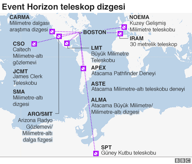 Kara deliğin fotoğrafını bir tek teleskopla çekmek mümkün değildi. Bu nedenle Bouman'ın yazdığı algoritma ile dünyanın farklı bölgelerindeki sekiz teleskoptan elde edilen veriler bir araya getirildi.