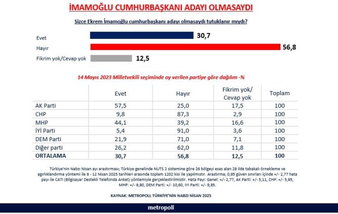 28 ilde 8-12 Nisan tarihleri arasında toplam 1202 kişi ile gerçekleştirilen anketi araştırma şirketinin yöneticisi Özer Sencar, sosyal medya hesabından paylaştı. Ankette katılımcılara, “Sizce Ekrem İmamoğlu cumhurbaşkanı adayı olmasaydı tutuklanır mıydı?” diye soruldu.