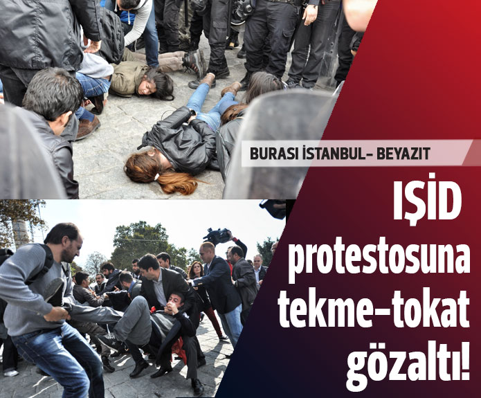 BEYAZIT Meydanı’nda IŞİD’i protesto etmek ve pankart açmak isteyen gruba polis müdahale etti. Yaka-paça gözaltına alınan 23 kişi sorgulanmak üzere İstanbul Emniyet Müdürlüğü’ne götürüldü.