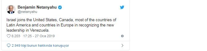 Açıklamayı video mesaj yayımlayarak yapan Netanyahu, "İsrail de ABD, Kanada, birçok Latin Amerika ülkesi ve Avrupa ülkesine katılarak Venezüella'daki yeni yönetimi tanıdı" dedi.