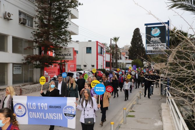 Kamu-Sen Kadın ve Çocuk Hakları Komitesi adına konuşma yapan Ayşe Özdemirağ ise, ILO 190 Sözleşmesi’nin Meclis’ten geçip yasallaştırılması gerektiğini söyledi. Bu taleplerini aktarmak için Başbakan’dan randevu talep ettiklerini ancak herhangi bir geri dönüş almadıklarını ifade eden Özdemirağ, tüm kadınları bu sözleşmenin yasallaşması için takipçi olmaya davet etti.
