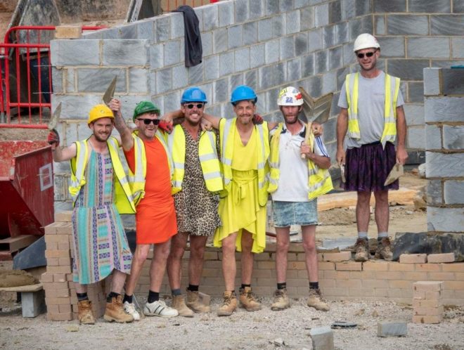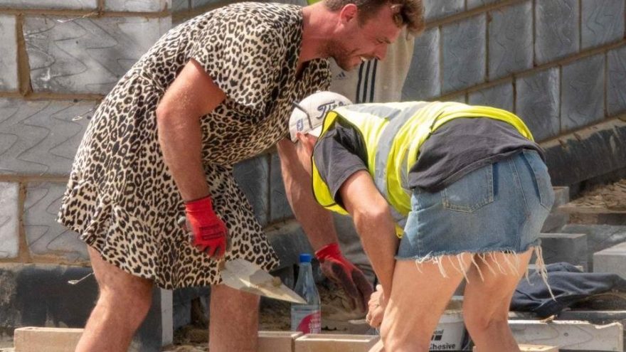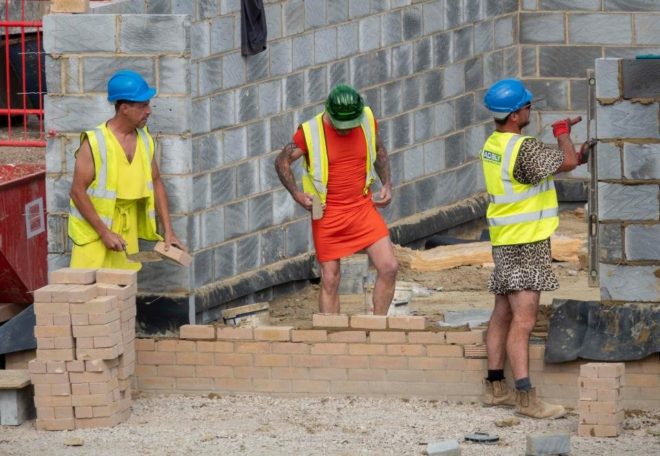 Pantolonla sıcak günlerde çok zorlanan işçiler, yasağa karşı ilginç bir çözüm geliştirdi. The Sun’ın haberine göre, şantiyedeki ofislerde çalışan kadınlardan ilham alan işçiler, şort yasağını etek ve elbiselerle delmeye başladı.