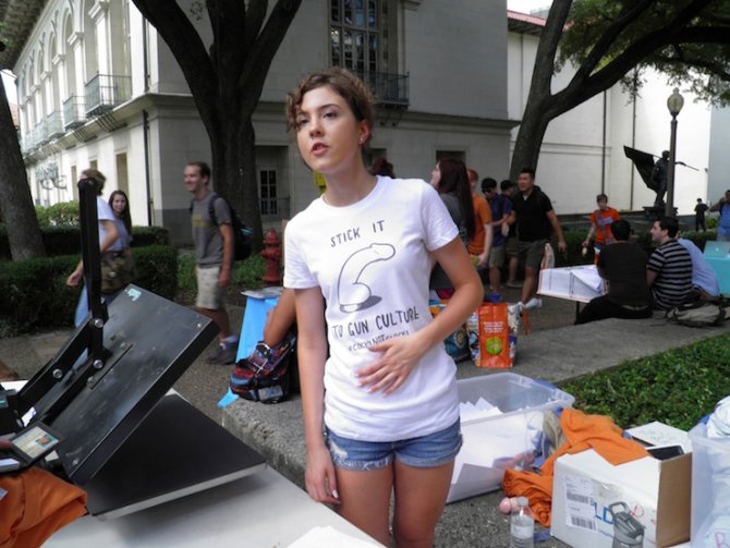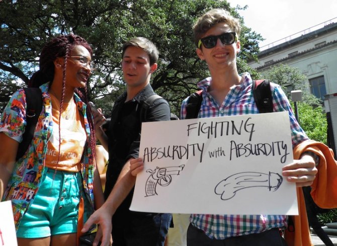 Reuters’te yer alan habere göre ‘Cocks Not Glocks: Campus Carry’ isimli protesto grubunun lideri Jessica Lin, yaptıkları eylemi, “Absürtlüğe karşı absürtlükle savaşıyoruz” diye açıkladı.