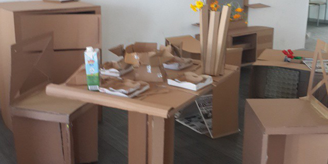 Tasarlanan ve kartonla yapılan gerçek ölçeğindeki mobilya ve eşyalar GAÜ Mimarlık, Tasarım ve Güzel Sanatlar Faskültesi giriş alanında sergilendi.