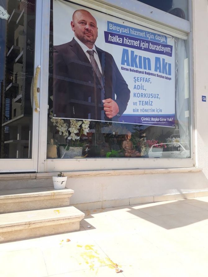 Girne'de Bağımsız Belediye Başkan adayı Akın Akı'nın seçim ofisine bilinmeyen kişi veya kişilerce üzerine arapça harflerle büyü olduğu düşünülen yumurtalar atıldı.