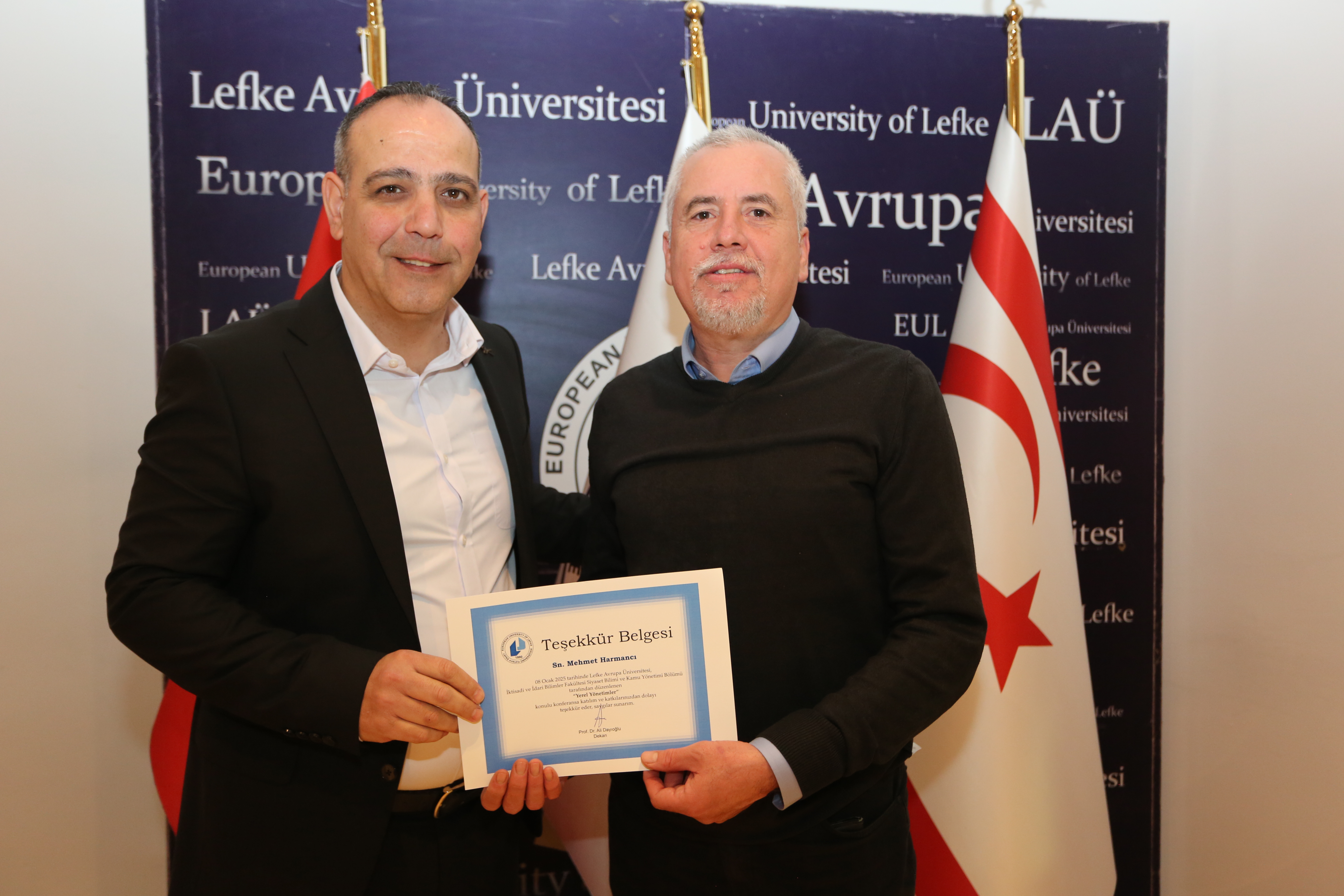 Konferansın sonunda öğrencilerin sorularını cevaplayan ve onlarla hatıra fotoğrafları çektiren, Lefkoşa Türk Belediyesi Başkanı Mehmet Harmancı’ya, LAÜ İktisadi ve İdari Bilimler Fakültesi Dekanı Prof. Dr. Ali Dayıoğlu tarafından katılım plaketi takdim edildi.