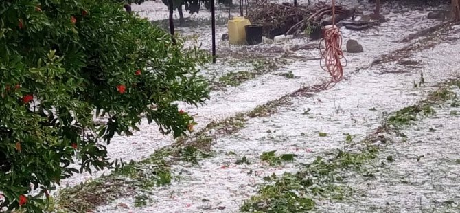Bir anda gök gürültülü sağanak halinde yağan yağmura, başparmak büyüklüğünde dolu da eklenince yollar ve ağaçlar beyaza büründü.