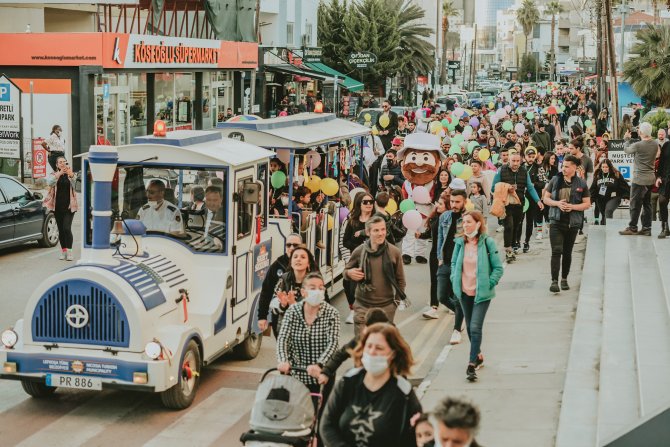 Yürüyüşte rengarenk çoraplar, balonlar ve şemsiyelerin yanı sıra, orkestra ve LTB Gezi Treni Lefkoşa’nın en işlek caddesini coşku, mutluluk ve gülen yüzlerle dolu bir karnaval havasına dönüştürdü.