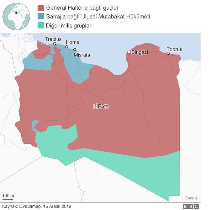 Libya'nın Trablus ve Sirte gibi batısındaki şehirleri BM tarafından desteklenen ve uluslararası alanda tanınan Ulusal Mutabakat Hükümeti; doğu kesimlerini ise Tobruk merkezli General Halife Hafter'e bağlı gruplar kontrol ediyor. Libya'nın büyük oranda çöl olan güney kesimlerinin kontrolü de yerel aşiretlerin elinde.