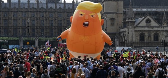 Eylemciler, Trump'ı ağlayan turuncu bir bebek olarak tasvir eden dev bir balon da uçurdu. Yaklaşık altı metre boyundaki balonda, bebek bezi giydirilerek resmedilen Trump'ın elindeki cep telefonuyla da attığı saldırgan tweet'lere gönderme yapılıyor. Parlamento binası üzerinde de uçurulan balona, Trump karşıtı gösterilere destek veren Londra Belediye Sadiq Khan tarafından izin verilmişti.Eylemin organizatörlerinden Matthew Bonner, "Trump'ı bir bebek olarak göstermek, kırılgan egosunu hedef almak için müthiş bir yol ve onunla dalga geçmek temel motivasyonumuz" dedi. Davranış ve politikalarına verilen toplumsal tepkilerin Trump'ı etkilemediğini vurgulayan Bonner, "Trump'ı mantıklı bir şekilde ikna edemezsiniz. Onunla ancak alay edebilirsiniz" ifadesini kullandı.