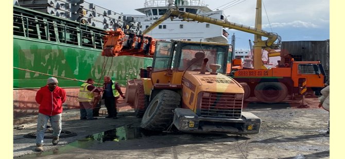 Gazimağusa Limanı'nda bugün saat 11.00 sularında AMİRA isimli çimento gemisine dozer yüklemesi sırasında vincin halatları kopması neticesinde yaklaşık 20 ton ağırlığındaki dozer 10 metre yükseklikten asfalt zemine çakıldı.