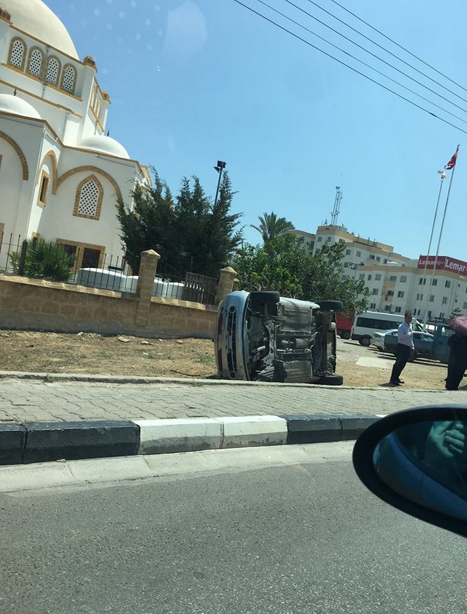 Mağusa'da Sakarya çemberinde meydana gelen kaza sonucu bir araç devrilerek yan yattı.