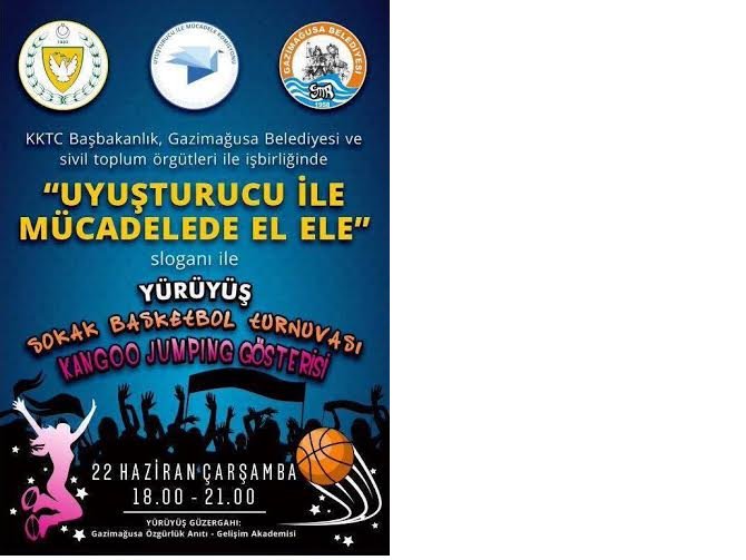 6 Haziran Dünya Uyuşturucu Kullanımı ve Kaçakçılığı ile Mücadele Günü kapsamında Başbakanlık Uyuşturucu ile Mücadele Komisyonu ile Gazimağusa Belediyesi işbirliğinde “Uyuşturucu ile Mücadelede el ele” sloganı ile 22 Haziran Çarşamba günü saat 18:00’da Gazimağusa’da yürüyüş düzenleniyor. “2. Uyuşturucu ile Mücadele Şöleni”nin bir parçası olarak saat 18:00’da Gazimağusa Zafer Anıtı’ndan Mağusa Gelişim Akademisi Tesisi’ne yürüyüş ile başlayacak etkinlik, MGA’da devam edecek ve sokak basketbol turnuvası ve kangoo jumping gösterisi yer alacak.