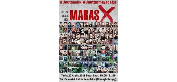 KKTC Alevi Kültür Merkezi, 19-26 Aralık 1978 tarihleri arasında Türkiye’nin Maraş şehrinde gerçekleştirilen saldırılar sonucu hayatını yitirenleri anmak amacıyla Pazar günü etkinlik düzenliyor.