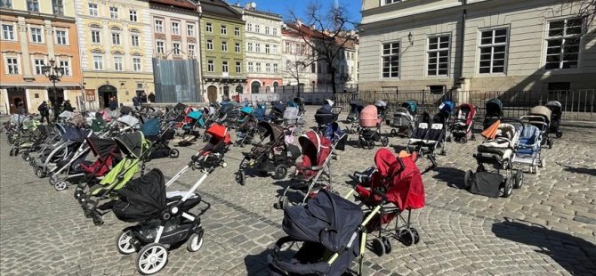 Rynok Meydanı'nda düzenlenen anma töreninde, Rus saldırılarında hayatını kaybeden 109 çocuk için meydana boş bebek arabaları bırakıldı.