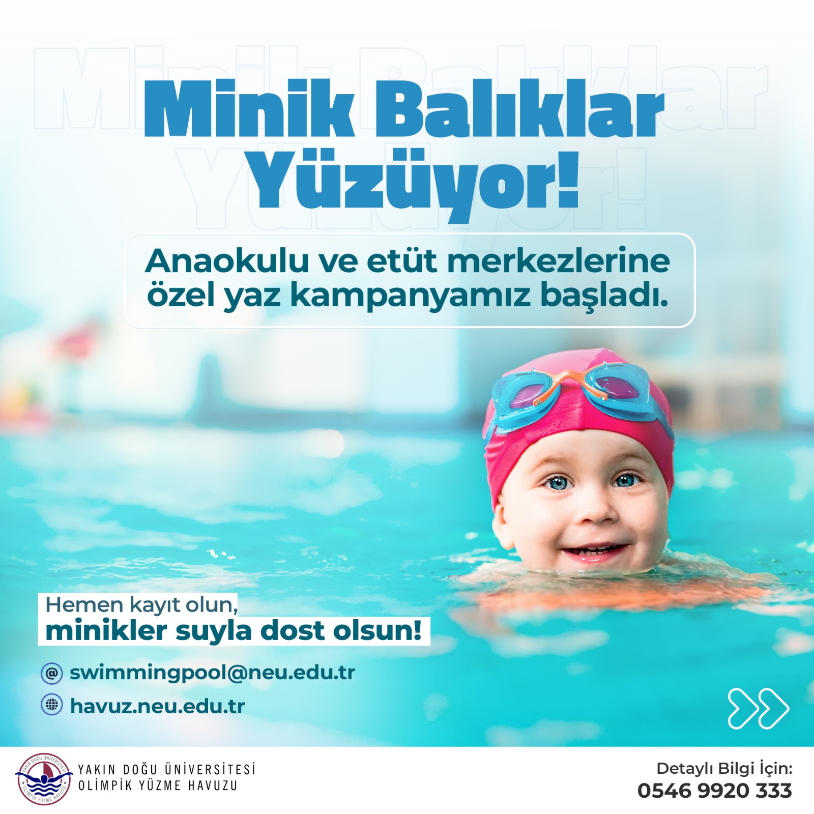 “Minik Balıklar Yüzüyor!” programı, çocukların suyla barışmasını sağlarken; özgüveni yüksek, enerjik ve sağlıklı bireyler olarak gelişimlerine katkı sunuyor. Yakın Doğu Üniversitesi Olimpik Yüzme Havuzu ise bu süreci sunduğu modern ve güvenli altyapı ile destekliyor.