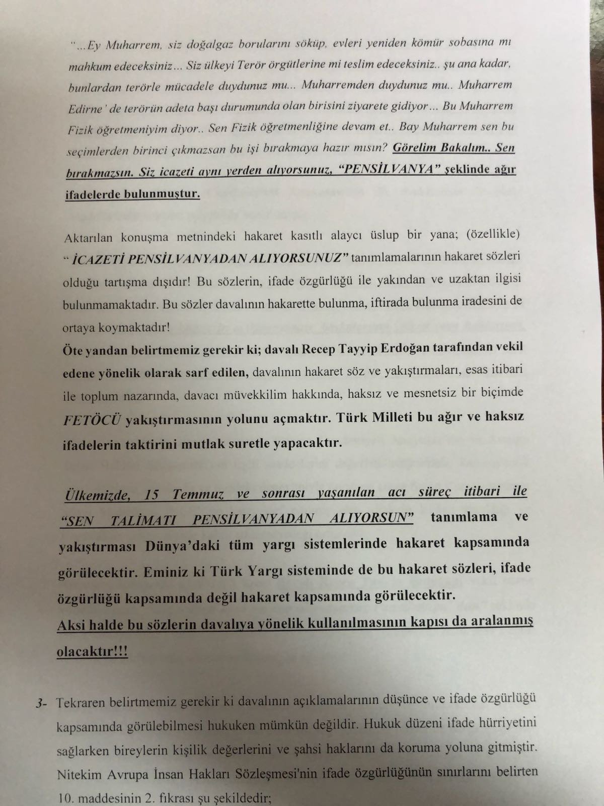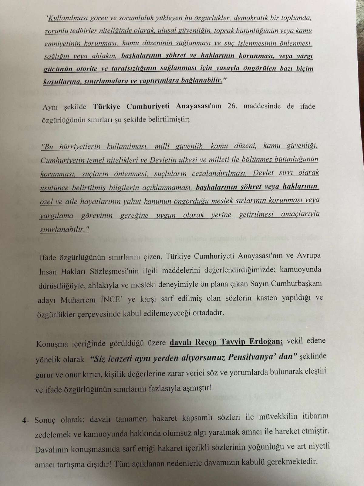 Hazırlanan dava dosyasında; “Konuşma içeriğinde görüldüğü üzere davalı Recep Tayyip Erdoğan; İnce’ye yönelik olarak “Siz icazeti aynı yerden alıyorsunuz Pensilvanya' dan” şeklinde gurur ve onur kırıcı, kişilik değerlerine zarar verici söz ve yorumlarda bulunarak eleştiri ve ifade özgürlüğünün sınırlarını fazlasıyla aşmıştır!” ifadelerine yer verildi.