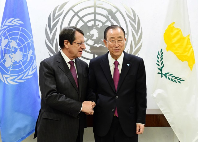 Anastasiades Birleşmiş Milletler Genel Sekreteri Ban Ki-moon ile gerçekleştirdiği görüşmede, kendisinden Kıbrıs sorununun çözüm çabalarında, yardım ve katkısını talep etti. Rum Lider görüşmeden sonra yaptığı açıklamada, en kısa sürede Kıbrıs’ı tekrardan birleştirecek, işgal ordularından, garantörlerden ve garantörlüklerden kurtaracak bir çözüm bulunması için, tüm tarafların etkin bir şekilde katkı koymaları gerektiğini savundu.