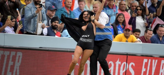 Elena Zdorovetskiy, Londra'da İngiltere ile Yeni Zelanda arasında oynanan Kriket Dünya Kupası finalinde, oğlu Vitaly’ye ait cinsel içerikli film sitesinin reklamı olan mayo ile sahaya girmeye çalıştı.