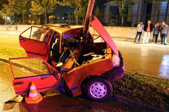 Bursa'da akrabalarının düğününden dönen 3 arkadaşın kaza yaptığı araç ağaca çarparak ikiye bölünürken, sürücü araç içinde sıkıştı. Sürücününolay yerine gelen yakını sinir krizi geçirdi.