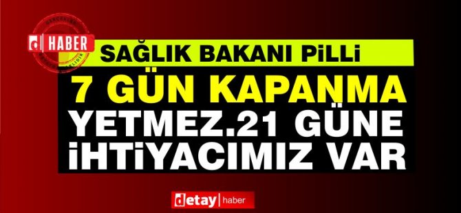 Bakan Pilli 7 günde salgının kontrol altına alınamayacağını söyledi. Pilli en az 21 gün kapanmaya ihtiyaç olduğunu söyledi ve kademe kademe durumun kontrol altına alınabileceğini ifade etti