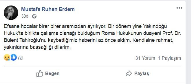 Tanınmış Roma Hukuku alanında önemli isimlerden Prof. Bülent Tahiroğlu yaşamını yitirdi.
