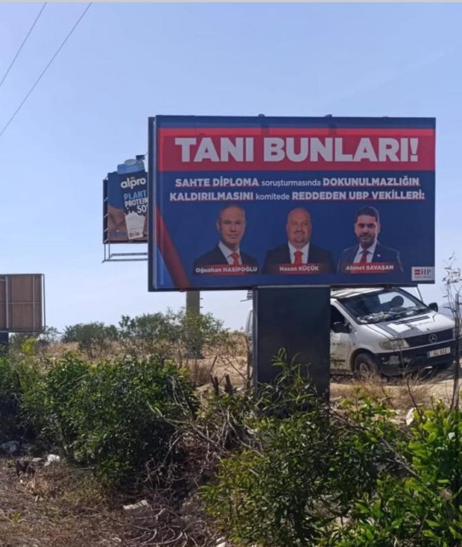 Halkın Partisi (HP), Lefkoşa’nın çeşitli bölgelerindeki bilbordlara yapıştırdığı afişlerle dikkat çekti. Afişlerde, Ulusal Birlik Partisi’ne (UBP) mensup milletvekilleri Hasan Küçük, Ahmet Savaşan ve Oğuzhan Hasipoğlu’nun fotoğraflarına yer verildi. Söz konusu üç isim aynı zamanda Meclis komitelerinde görev yapan üyeler arasında yer alıyor.
