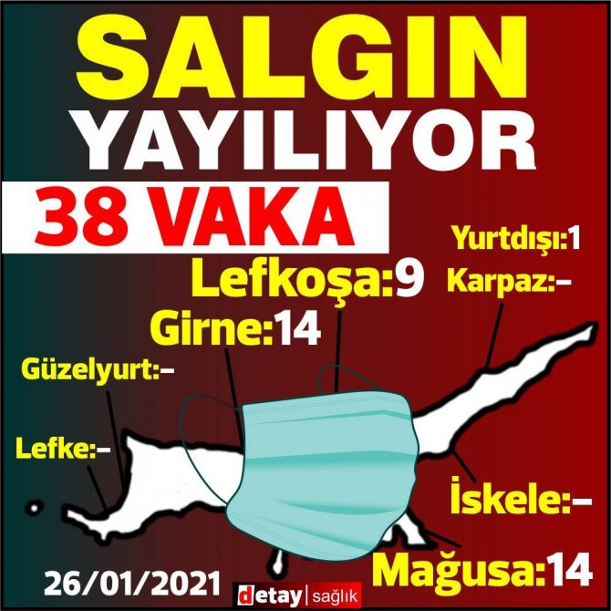 Bakan Pilli: "Toplam 3665 test yapıldı, 34'ü yerel 38 pozitif vakaya rastlandı, 1 kişi yoğun bakıma alındı" Sağlık Bakanı Dr. Ali Pilli, son 24 saatte yapılan test sayısının 3665 olduğunu, 34'ü yerel 38 pozitif vakaya rastlandığını , 1kişinin yoğun bakıma alındığını, 19 kişinin taburcu edildiğini açıkladı. Bakan Pilli, 1 kişinin hava yolu ile ülkemize geldiğini, vakalardan 3 kişinin daha önce tespit edilen vakaların temaslıları olduğunu ve bu süre içinde gözetim altında bulunduklarını, 34 kişinin ise yerel vaka olduğunu kaydetti. Pilli, vakalardan 9 kişinin Lefkoşa, 14 kişinin Girne, 14 kişinin Mağusa Bölgesi'nden olduğunu belirtti.