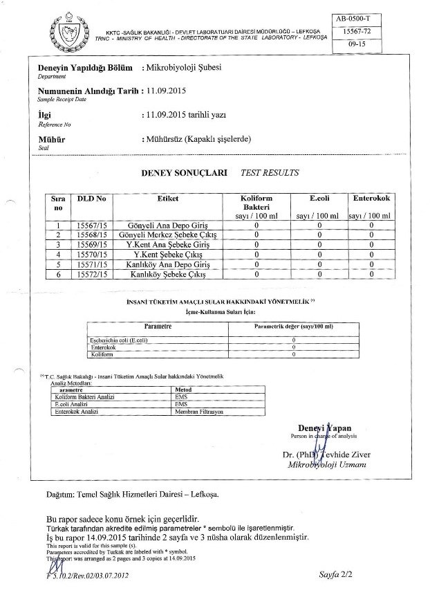Mikrobiyoloji Uzmanı Dr. Tevhide Ziver imzalı rapor ile bildirilen sonuçlar, Gönyeli’deki suyun içme ve kullanım anlamında hiçbir olumsuzluk içermediğini kayıt altına aldı.