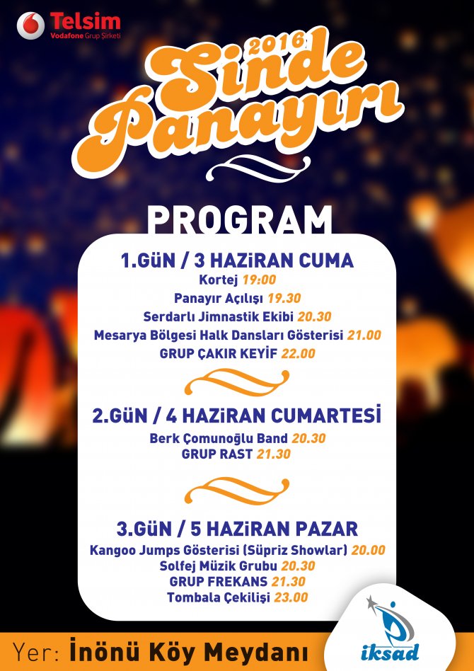 Köy meydanında saat 18.30’da kortej yürüyüşüyle başlayacak panayır, halk dansları gösterileri; Grup Çakır Keyif, Berk Çomunoğlu The Band, Grup Rast, Selfej Müzik ve Grup Frekans konserleri; Kangoo Jumps Show ile tombala çekilişiyle pazar gününe kadar sürecek.
