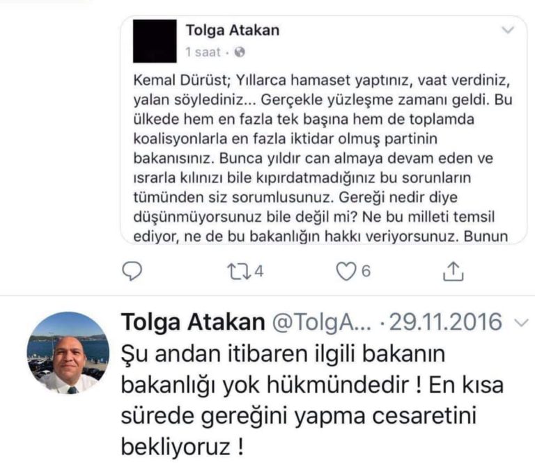 Refüjde bariyer olmaması yüzünden gerçekleşen ölümlü çarpışma sonrası Ulaştırma Bakanı Tolga Atakan'ı istifaya çağıran vatandaşlar, Tolga Atakan'a 4 kişinin Girne-Değirmenlik dağ yolunda hayatını kaybetmesi sonrası dönemin Bayındırlık ve Ulaştırma Bakanı’nı istifaya davet etmesini hatırlattı.