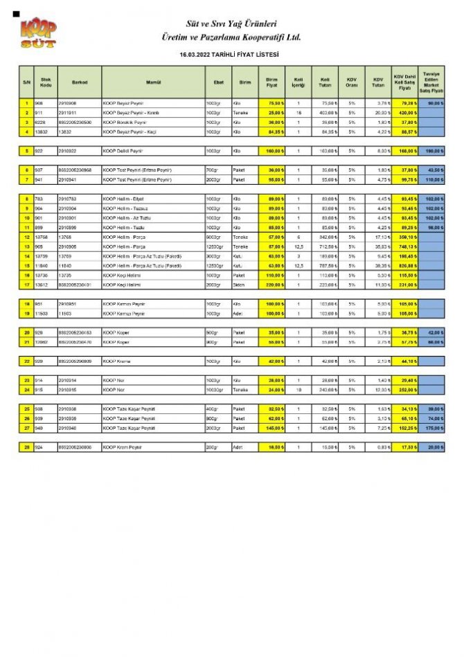 KOOPSÜT 16 Mart’tan itibaren geçerli olarak yeni ve zamlı fiyat listesini paylaştı.