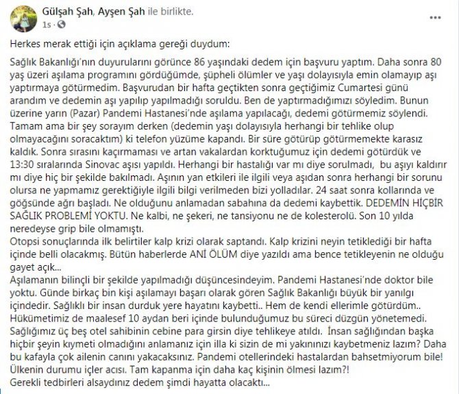 26 Ocak günü 86 yaşındaki İbrahim Abdi Gecekuşu'nun vefatının ardından torunu Gülşah Şah,sosyal medya hesabından dedesinin hiçbir sağlık sorununun olmadığını,ölümünün sağlık sistemindeki yetersizlikler ve aşı uygulamasıyla ile ilgili olduğunu düşündüğünü söyledi.