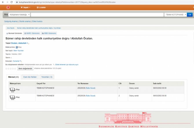 Öcalan'ın “Sümer Rahip Devletinden Halk Cumhuriyetine Doğru” kitabı TBMM kütüphanesi kayıtlarında
