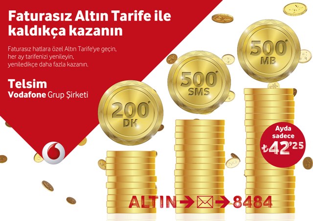 tarifelerindeki içerik zenginleşecek. Altın tarife abonelerinin hatlarına sadece 42,50TL/650 kontör karşılığında ilk ay 30 gün geçerli her yöne 150 dk, 250 SMS ve 250 MB internet yüklenir. Tarife, 30 günün sonunda bakiyeden düşecek şekilde 42,25TL /650 kontör karşılığında otomatik olarak yenilenir.