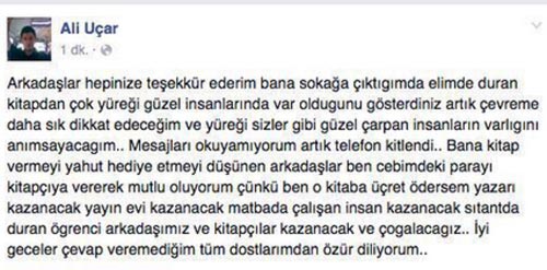 Ali Uçar açıklamasında kendini şöyle anlattı, ''Arkadaşlar fotoğraftaki kişi benim ve hiç utanmıyorum karşımda oturan kızın namusuna bakmadığım için... Ben cebi çok zengin biri değilim hatta ilkokul altı terkim, annem babam ayrı ama ben toplumun huzurunu kaçıran bir serseri olmadığım için utanmıyorum. Elbisem kirli, terliğim bindiğim metroya uygun değil, zihnimi kirletemiyorum... Param yettiğince Kitap alıyorum, kütüphaneye gidiyorum...'' Ali Uçar'ın bu açıklaması sosyal medyada hızla yayıldı ve destek mesajları almaya başladı. İnsanlar Ali'ye kitap hediye etmek istediklerini söylediler.