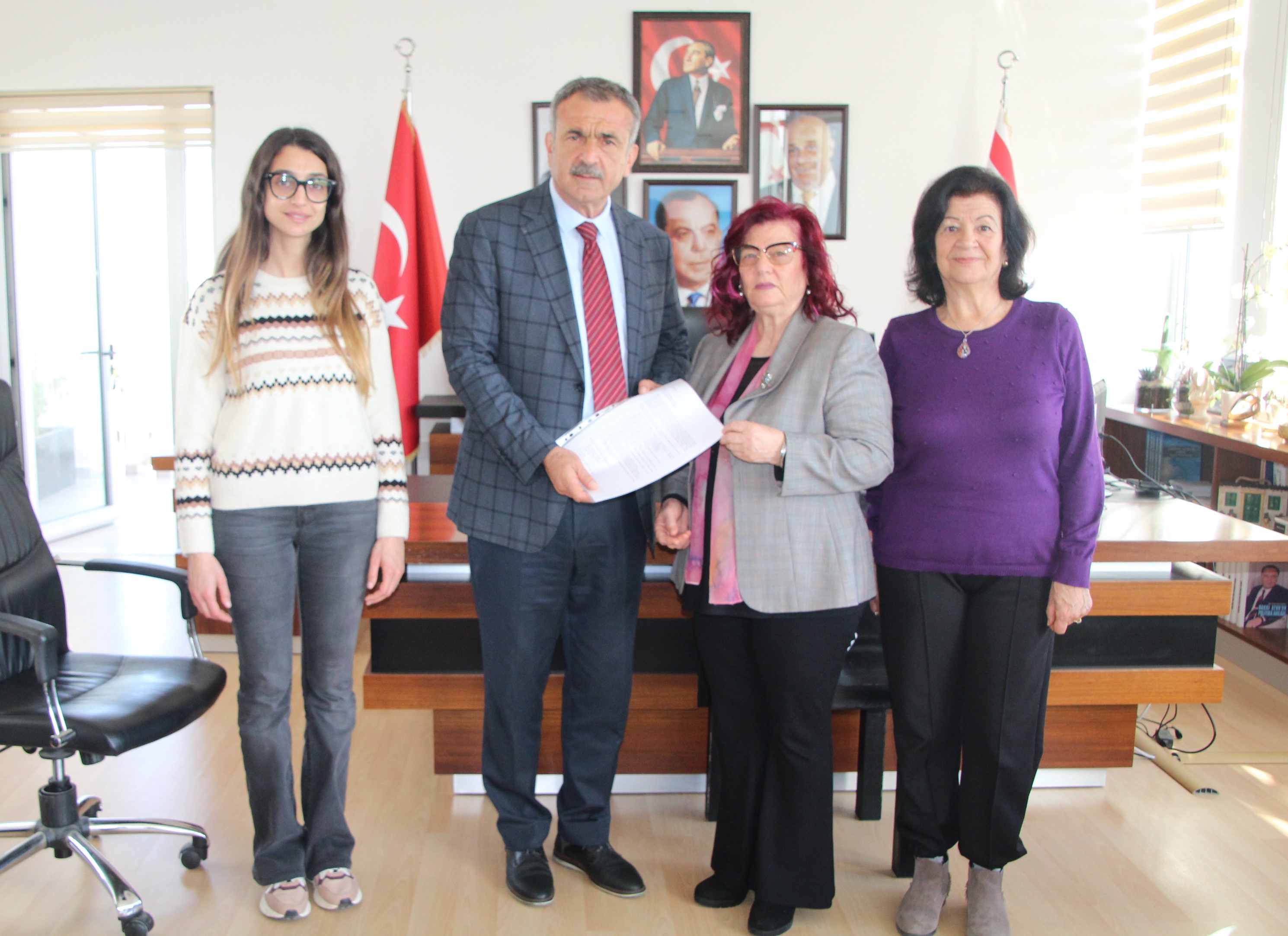 Toplumsal Mücadele Platformu üyesi Mağusa Kadın Merkezi Derneği (MAKAMER) ve CTP Gazimağusa Kadın Örgütü temsilcileri bugün Başkan Dr. Süleyman Uluçay’ı ziyaret ederek kadın hakları konusunda yazılı olarak taleplerini sundu ve Başkan Uluçay’ı etkinliklerine davet etti. Ziyarette MAKAMER Başkanı Sıdıka Özdoğan, CTP Gazimağusa Kadın örgütü Sekreteri Asya İlktaç ve MAKAMER Yönetim Kurulu Üyesi Serap Akalınlar yer aldı. Platformun yazılı olarak sunduğu talepleri arasında: kadın sığınma evi konusunda devletin girişimde bulunması, Toplumsal Cinsiyet Eşitliği Dairesi’nin aktif hale getirilmesi, her bölgeye çocuk izlem merkezi kurulması, ücretsiz kamusal kreş ve etüt imkanı sunulması, özel sektörde sendikalı olunması, ev içi emeğin aile işçiliği olarak tanımlanması, kadın cinayetlerinde karşı caydırıcı yasalar yapılması gibi konular yer aldı.