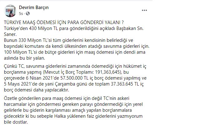 Özetle gönderilen para maaş ödemesi için değil TC'nin askeri harcamalar için göndermesi gereken parayı göndermediği için yerel gelirlerle bu giderin karşılanması amaçlı yapılan borçlanmalara gidecektir ki bu sebeple Halka yüklenen faiz giderlerini yazmıyorum bile dostlar.