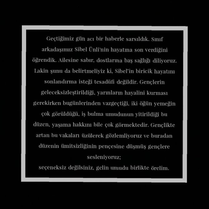 İstanbul Üniversitesi Edebiyat ve Ülke Atölyesi de, kaybettikleri sınıf arkadaşları için açıklama yayımladı. Açıklamada, Ünli'nin kaybıyla sarsıldıklarını söyleyen arkadaşları, ümitsizliğin pençesine düşmüş tüm sıra arkadaşlarına böyle seslendi: "Seçeneksiz değilsiniz, gelin umudu birlikte örelim."