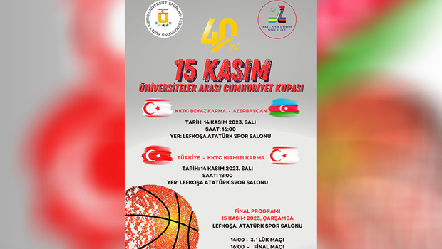 Kuzey Kıbrıs Üniversite Sporları Federasyonu (KKÜSF) ile KKTC Spor Dairesi Müdürlüğü işbirliğinde düzenlenecek olan 15 Kasım Cumhuriyet Kupası basketbol branşında 14-15 Kasım 2023 tarihlerinde Lefkoşa’da gerçekleşecek. Lefkoşa Atatürk Spor Salonu ev sahipliğinde gerçekleşecek olan organizasyona KKTC’den iki takım ile Türkiye ve Azerbaycan’dan birer üniversite takımı katılım gösterecek.
